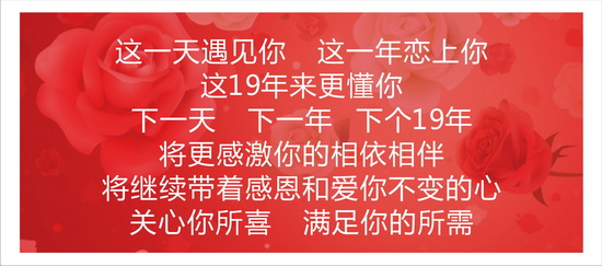 19年,这一路走来,6939个日夜,时间刻下了永恒的美丽,岁月留下了我们的故事。你是我流年里最美的记忆、最纯真的情怀。2015,我们的第一个19年,我在老地方等着你……