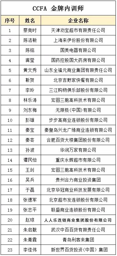 天津市人人乐商业有限公司培训部赵琼荣获“CCFA金牌内训师”荣誉称号