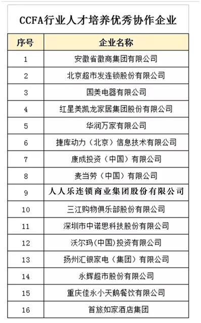 人人乐荣获“CCFA行业人才培养优秀协作企业”荣誉称号