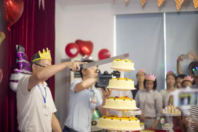 众人围着美食方桌,在主持人的号召下,寿星们轻掩双眸,倾心许愿,肖总和寿星们一起切蛋糕,一起分享这份甜蜜,传递这份幸福,时光在这一刻定格,众人大快朵颐,乐享此时。