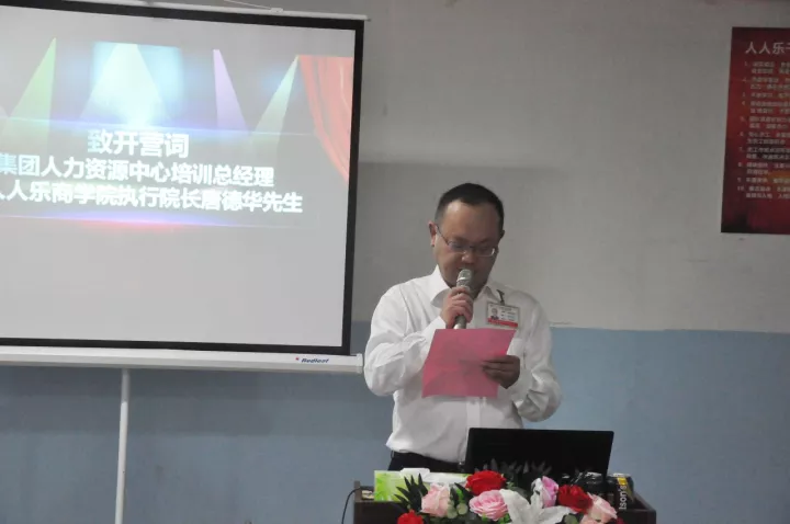 学员们一大早就开始排成整齐的队列迎接何董事长的到来,当何董下车款款步入培训室时,众学员用洪亮的问候声和激烈的掌声来表达对何董事长热情的欢迎,待众人落座,人人乐商学院陈丽娟总监主持,人人乐商学院执行院长唐德华先生致开营辞,学员杨阳代表众学员发言,表达学员们的心声与期盼。