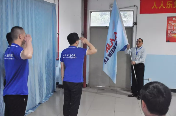 何董事长为储备店长们授旗,学员们向董事长敬礼并且庄严的接过旗帜,从此多了一份责任,多了一份重任,希望学员们不负众望,再接再厉,成为人人乐门店的优秀管理者。