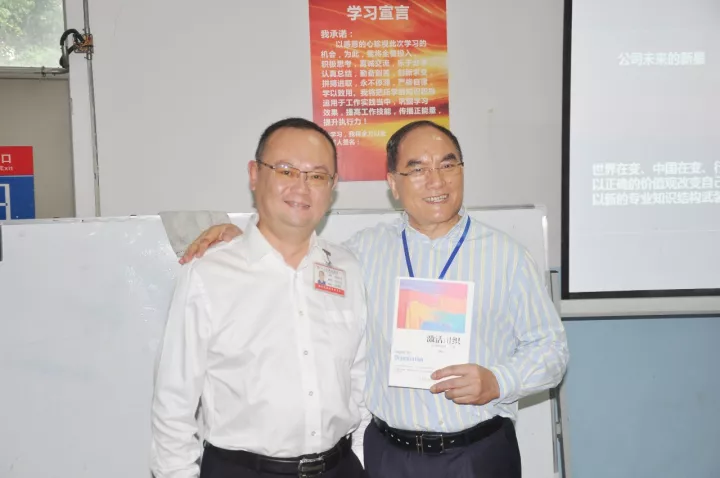 人人乐商学院为何董事长赠送《激活组织》书籍并亲切合影,在这个千载难逢的时刻,何董事长与唐总,陈总及众学员亲切合影,让人倍感温馨动容。