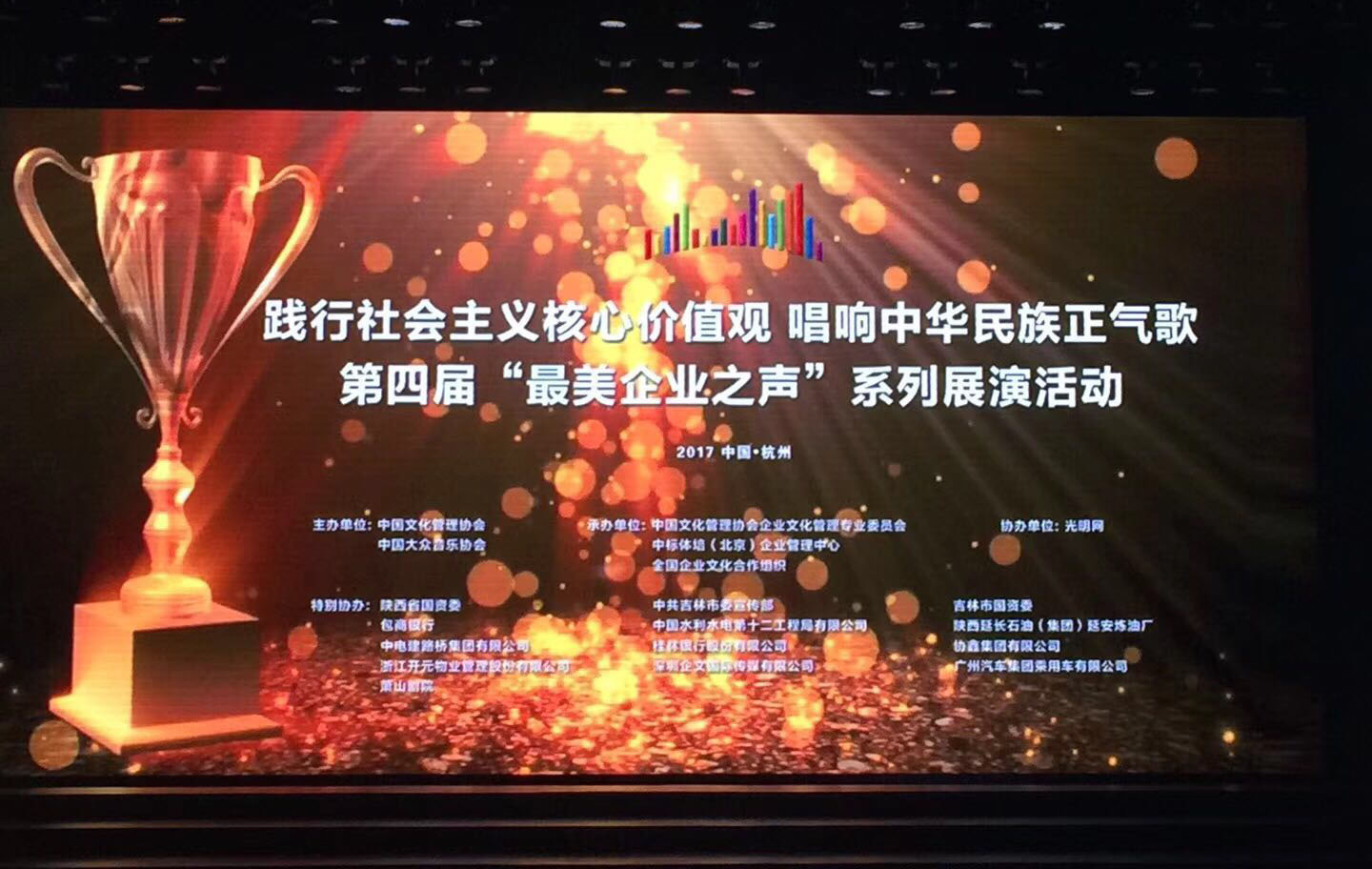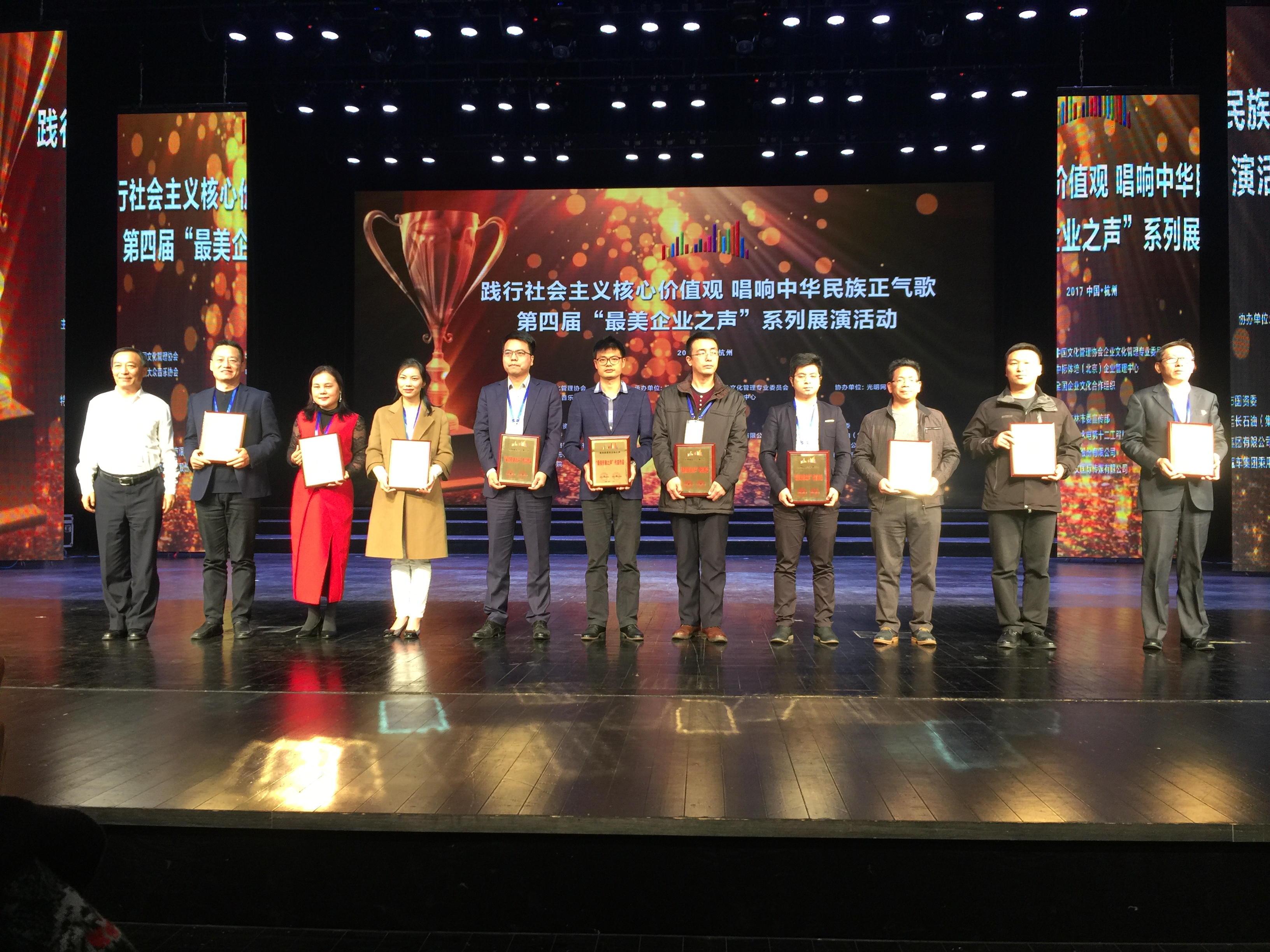 2017年11月17-18日,在中宣部等部门的倡导支持下,由中国文化管理协会,企业文化管理专业委员会共同主办的“2017中国企业文化管理年会”之践行社会主义核心价值观,唱响中华民族正气歌,第四届“最美企业之声”系列展演活动在风景如画的浙江杭州萧山剧场成功举办。