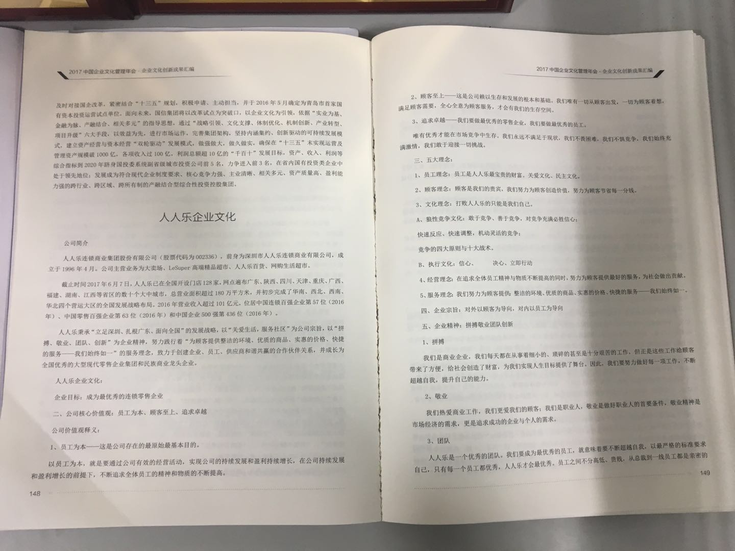 人人乐本次作为被邀请的知名企业之一,积极响应中国企业文化管理协会的号召,在公司领导的关注和支持下,人人乐商学院精心收集整理的《人人乐企业文化手册》包括公司简介、企业目标、公司核心价值观及释义,五大理念、企业宗旨、企业精神、文化品格等。这些精神食粮是人人乐21年来的文化积淀与精神提炼总结,在宏观的角度指导和引领了人人乐人不断奋进,开拓进取。