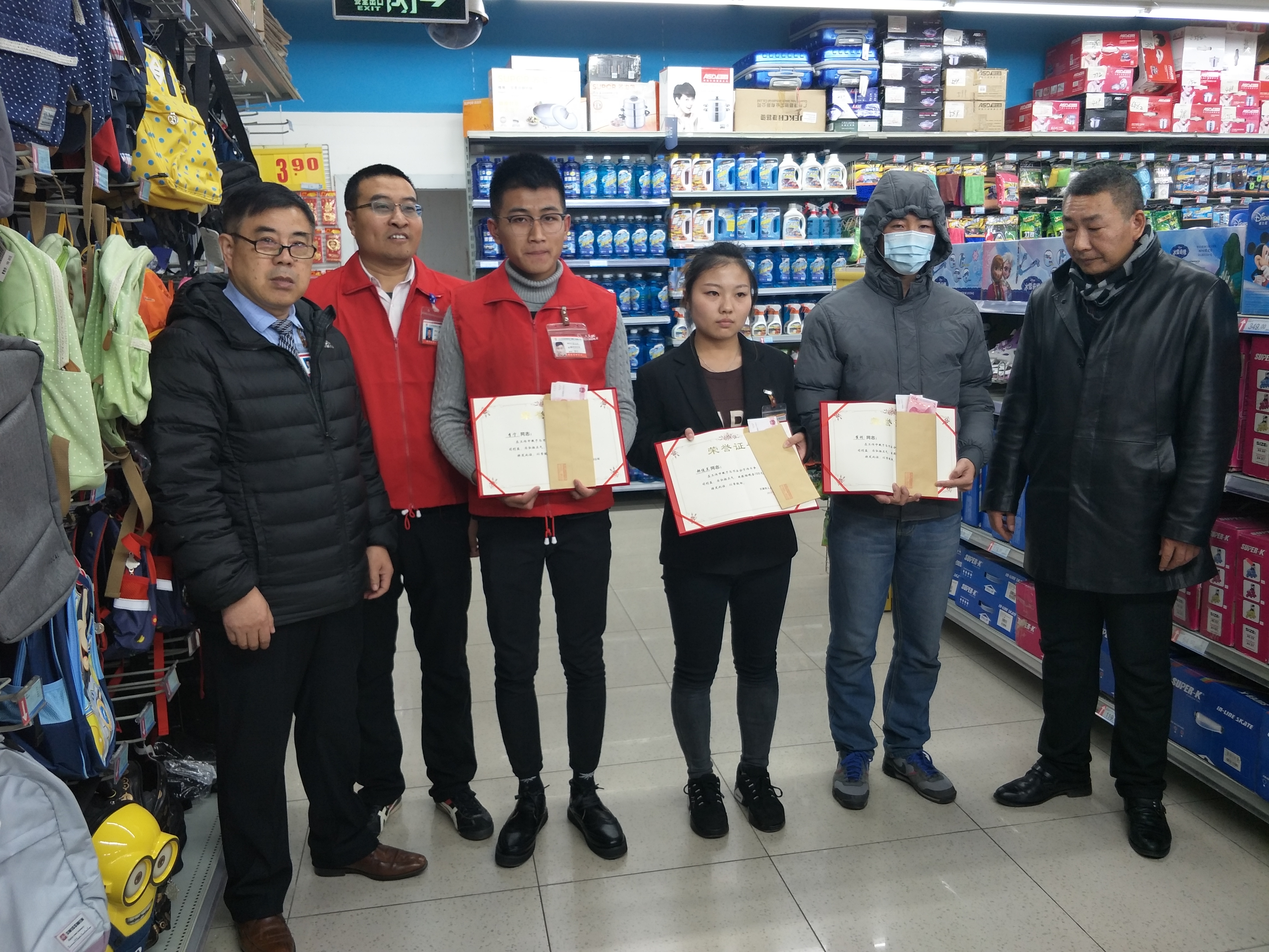 2017年11月25日,天津开发区店便衣专员崔利、监控专员郝俊兰、商品部员工李宁坚守岗位,勇抓盗贼,面对犯罪分子的殴打与威胁,不妥协不屈服,顽强抵抗,维护了公司利益,挽回了公司损失,受到集团、门店证书及现金奖励。